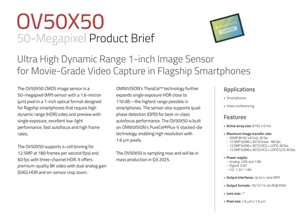 这颗镜头可能就是之前已经宣布量产的“OV50X”,在今年4月发布,拥有5000万像素,像素尺寸为1.6微米,专为旗舰智能手机设计。