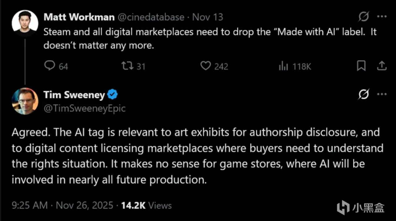 在回应X平台用户关于取消生成式AI标签的建议时,斯威尼写道:“AI标签只适合艺术展览(用于披露作者身份)或数字内容授权市场(买家需了解版权情况)。对游戏商店来说没意义,因为AI很快会参与几乎所有未来作品的制作。”