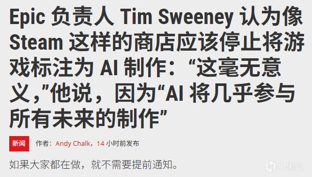Epic Games CEO蒂姆·斯威尼公开表示,Steam等平台对游戏使用生成式AI进行标注“毫无意义”,因为未来几乎所有游戏制作都会涉及AI。
