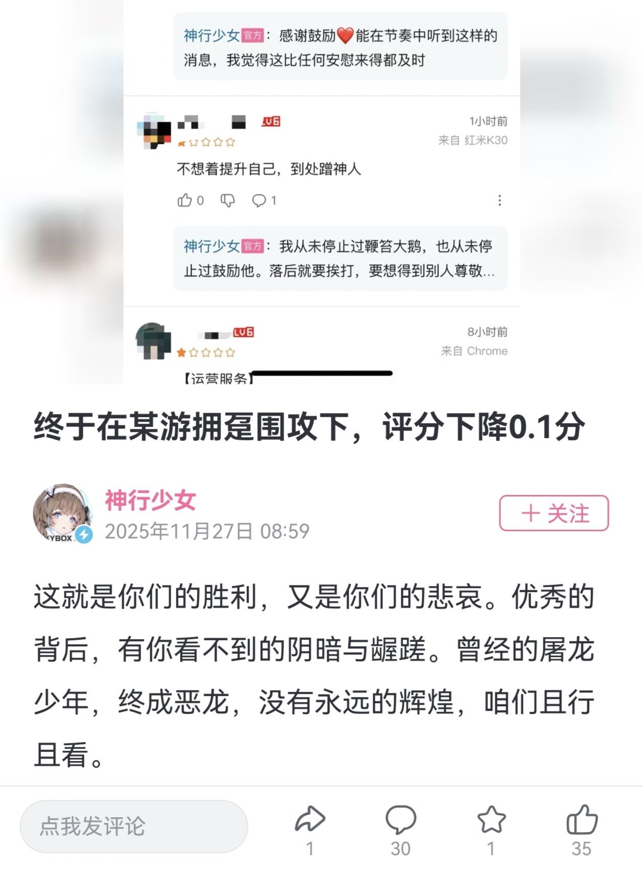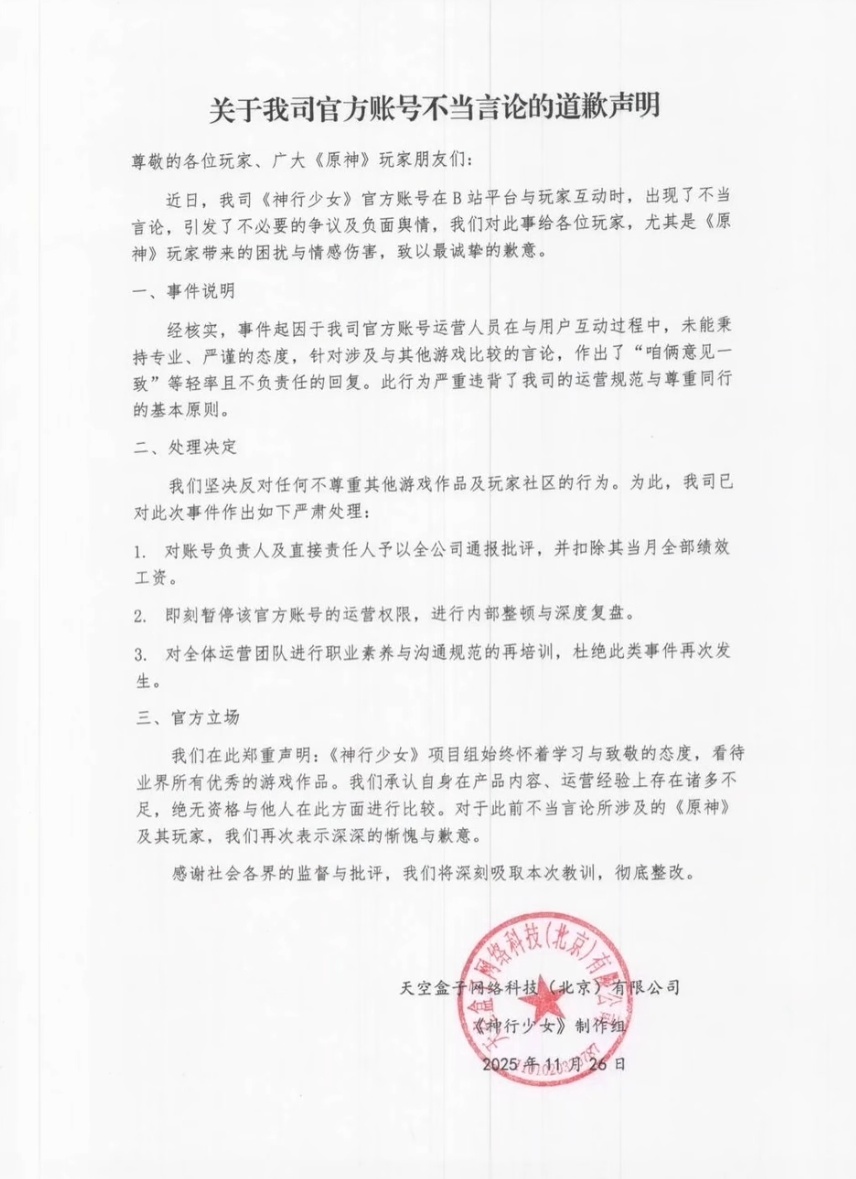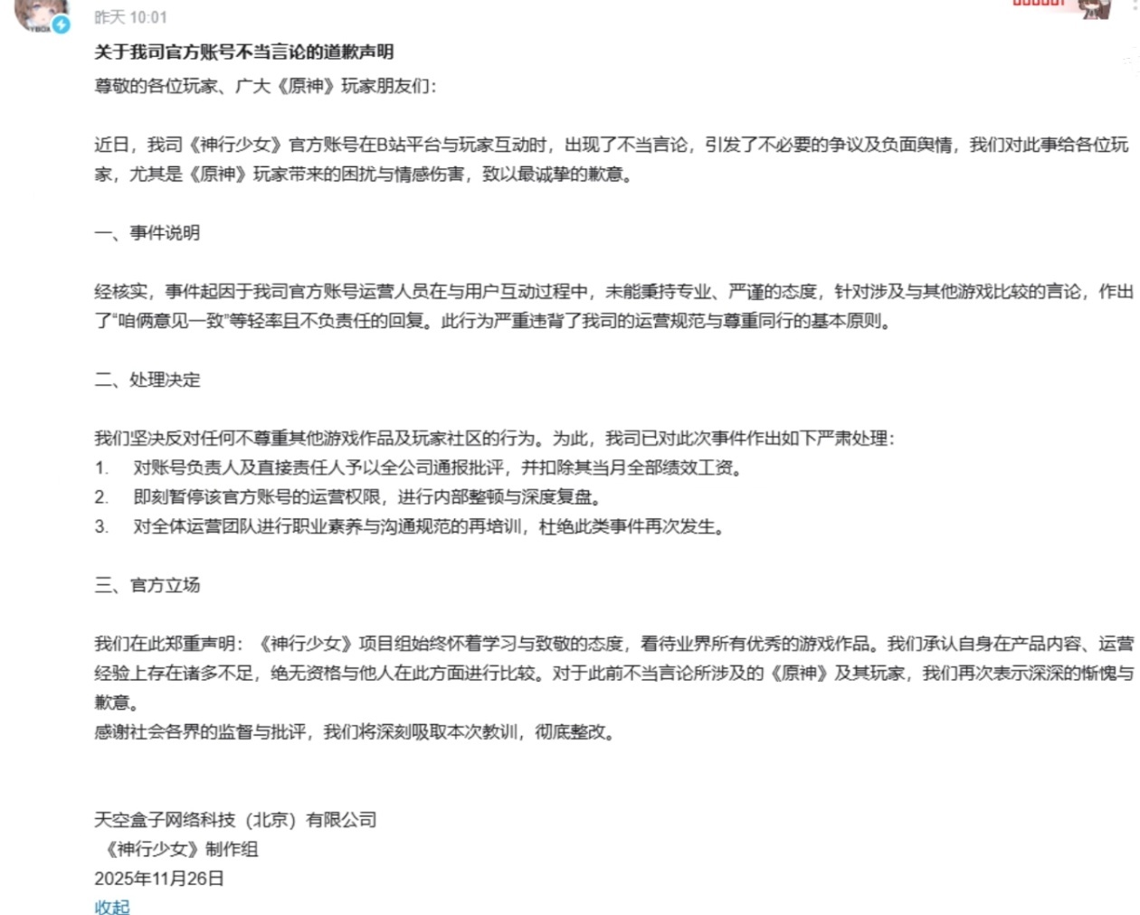 2025年11月26日,手游《神行少女》官方B站账号发布公开道歉声明,就B站运营人员与玩家互动时的不当言论,向《原神》玩家及全体用户致歉,同时公布了对涉事人员的处理决定(后又删除公告)。