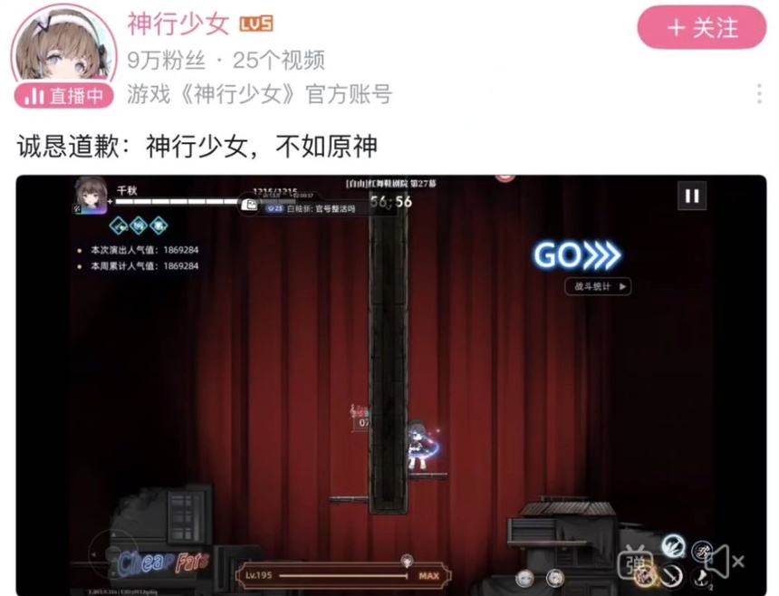道歉声明发布后,《神行少女》官方B站账号于次日开启直播,标题标注“诚恳道歉:神行少女,不如原神”。