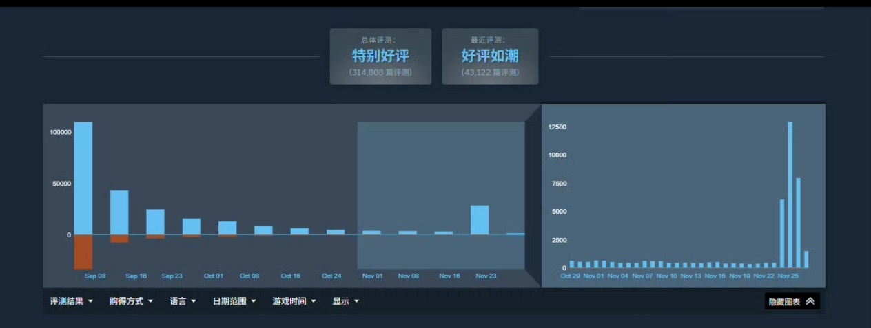 曾因中文翻译和难度问题在首发期引发争议的《空洞骑士:丝之歌》,近期在Steam平台迎来了口碑大逆转。数据显示,在11月24日至26日期间,该作共收获26938条玩家好评。目前游戏近30天评价已达到“好评如潮”级别,好评率高达96%;所有历史评价也为“特别好评”,好评率稳定在87%。