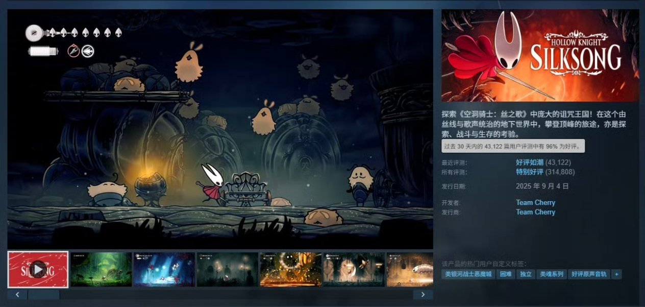 这一成绩标志着Team Cherry打造的这款类银河恶魔城游戏彻底实现了口碑翻身。游戏发售后,开发团队积极回应玩家反馈,不仅优化了简体中文翻译质量,还通过更新调整了部分难度设计,使游戏体验更为平滑。《空洞骑士:丝之歌》于2025年9月4日正式发售,首周即创下全球销量突破500万份的佳绩,Steam在线峰值高达56万人。游戏在评分汇总网站OpenCritic上也获得了罕见的满分评价,被多家媒体誉为“类银河恶魔城游戏的巅峰之作”。