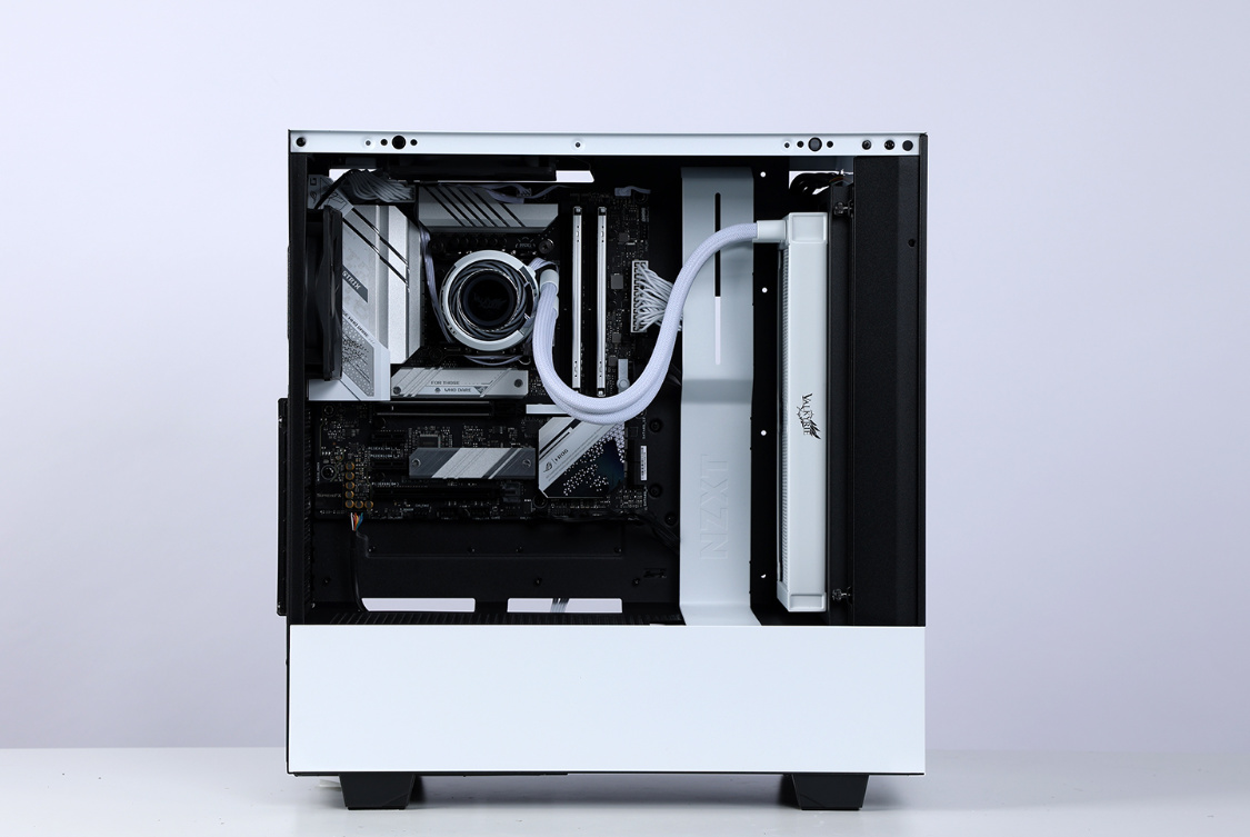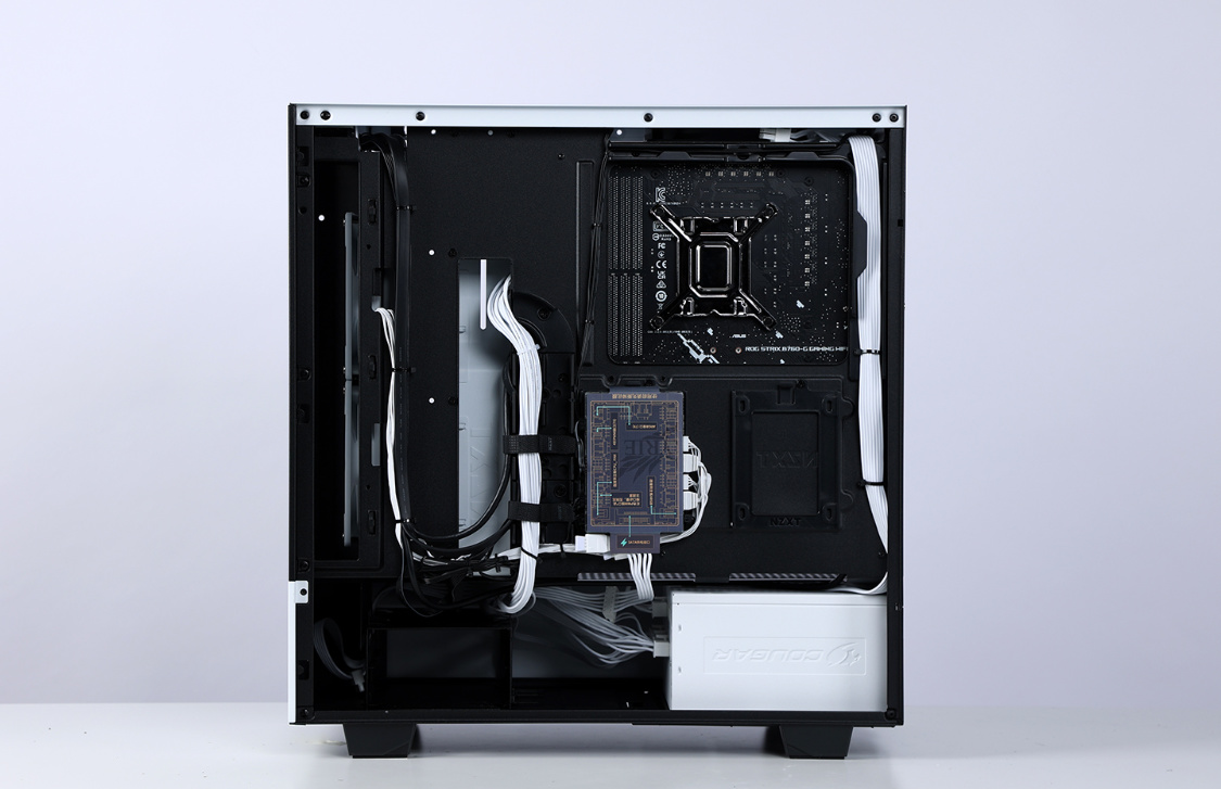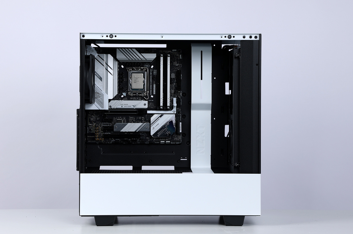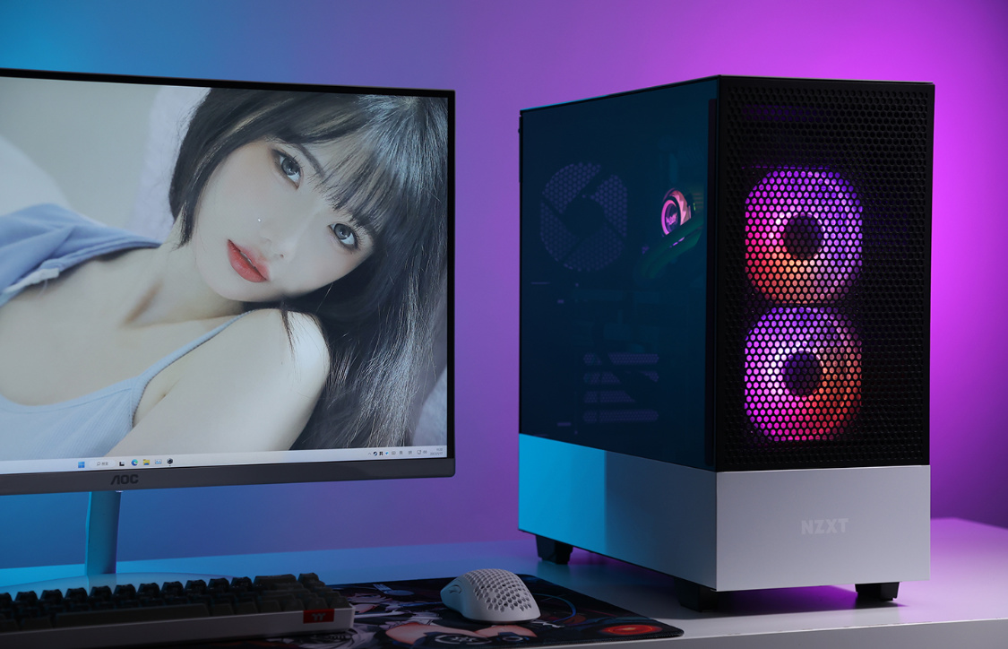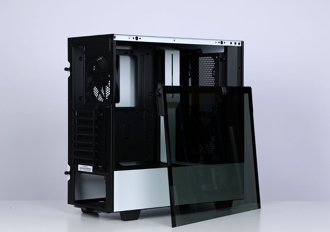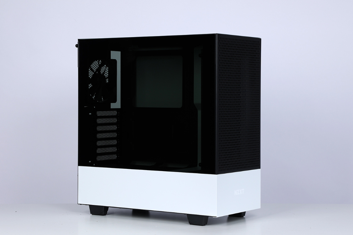 机箱选择的是恩杰H510 Flow白色版,机箱整体设计非常简约,但是黑白撞色的搭配,整体质感非常不错。主流的钢化玻璃侧透面板,采用暗化处理,一定程度上弱化了机箱内部配件ARGB灯效,但颜值依旧在线。