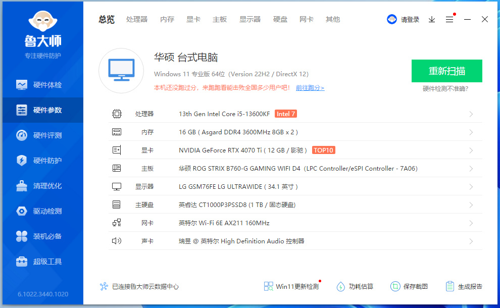 完整配置单:i5-13600KF处理器、华硕ROG STRIX B760-G GAMING WIFI D4 小吹雪主板、影驰RTX 4070Ti 金属大师OC显卡、阿斯加特 FREYR(弗雷) DDR4-3600MHz 8G*2 钛银甲内存、英睿达P3 Plus 1T M.2固态硬盘、瓦尔基里(VK)极夜 C240W-RGB 一体式水冷、骨伽 GEX 750W 白色版金牌全模组电源、恩杰H510 Flow 白色机箱...