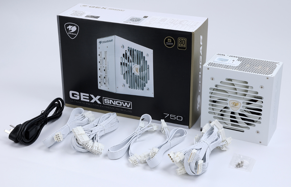 根据整机功耗,选定的电源是白色的骨伽 GEX 750W金牌全模组电源,足够匹配整机配件供电需求,再加上纯白的电源本体和模组接口,是相中它的理由。而且电源不仅拥有80 Plus金牌认证,还有7年以换代修的一流售后服务,可以说非常靠谱。