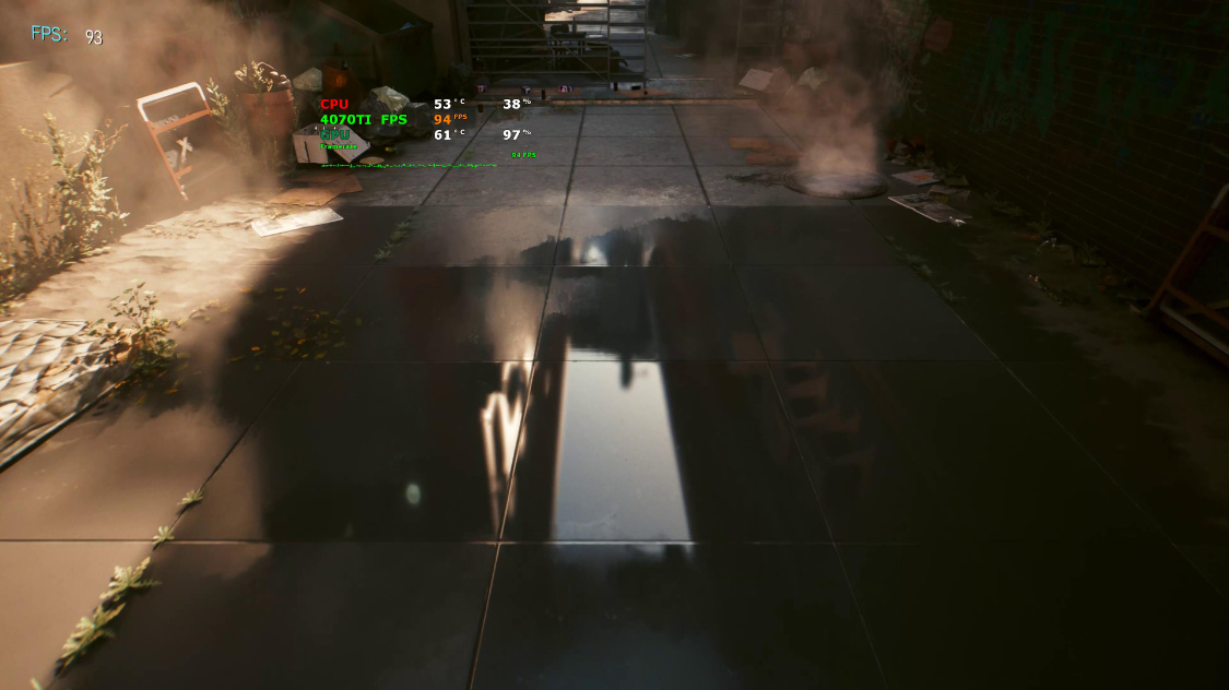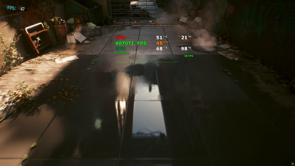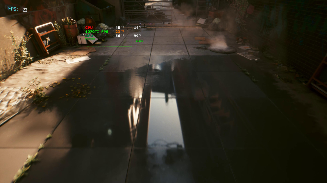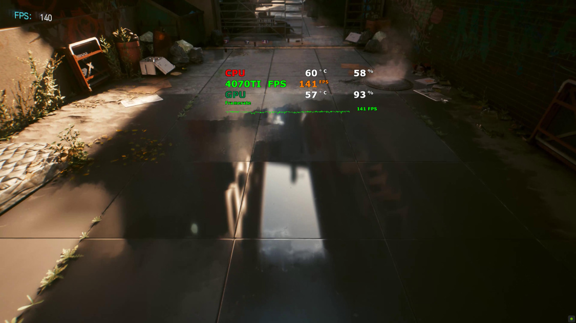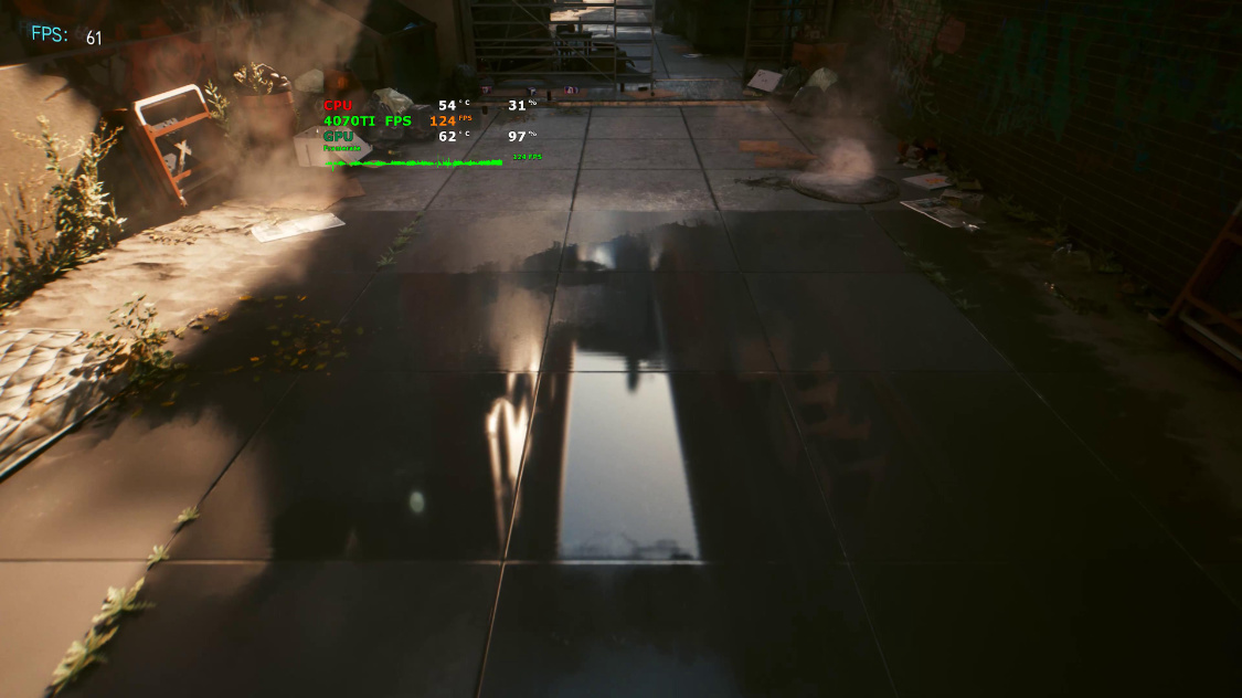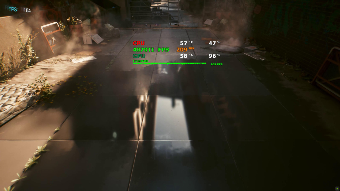 4K分辨率下,关闭DLSS时,游戏的实际帧率约为25FPS左右。开启超级性能模式下的DLSS 2.0后,游戏实际帧率约为95FPS左右。继续开启DLSS 3.0后,游戏实际帧率约为125FPS左右;