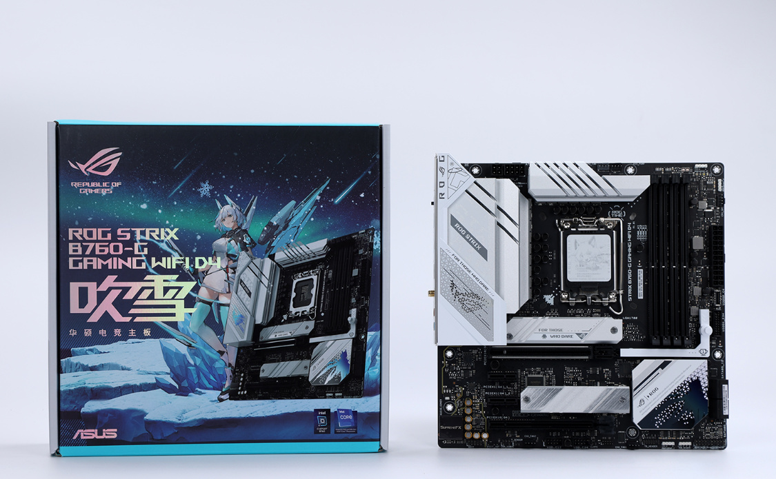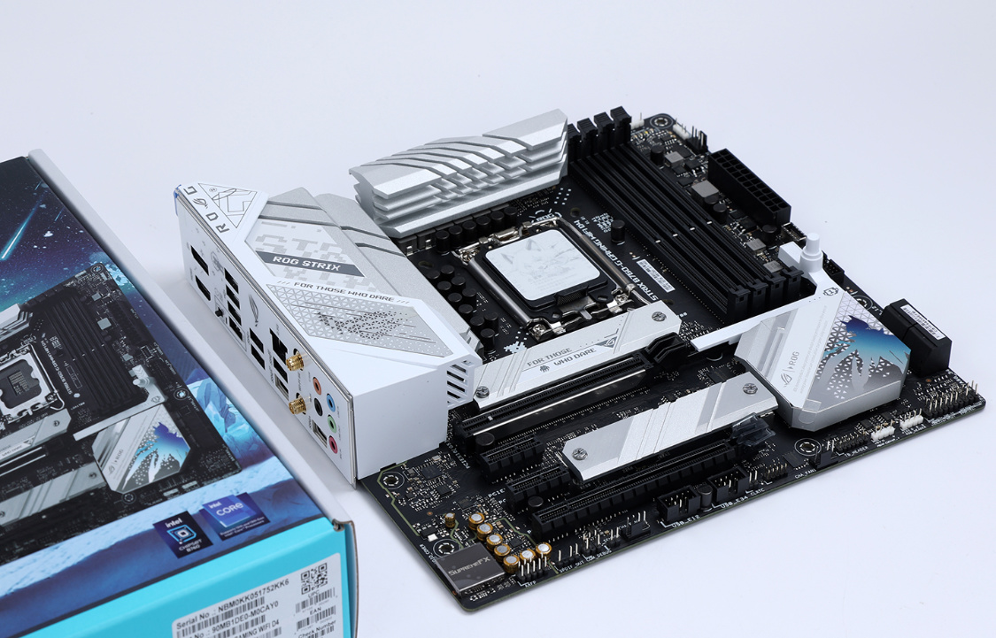带K的i5,预算足首选Z790,预算不足搭配B760同样YYDS。颜控朋友最终选择的是华硕ROG STRIX B760-G GAMING WIFI D4 小吹雪主板。MATX规格,主板采用了12+1相供电设计,搞定13600KF问题不大。虽然只能算是低配的ROG,但是大面积银白色金属装甲,颜值方面真的相当能打。
