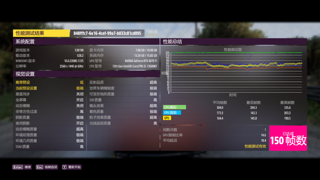 《极限竞速·地平线5》基准测试,极端画质,光追高,2K分辨率,游戏平均帧率为150FPS;
