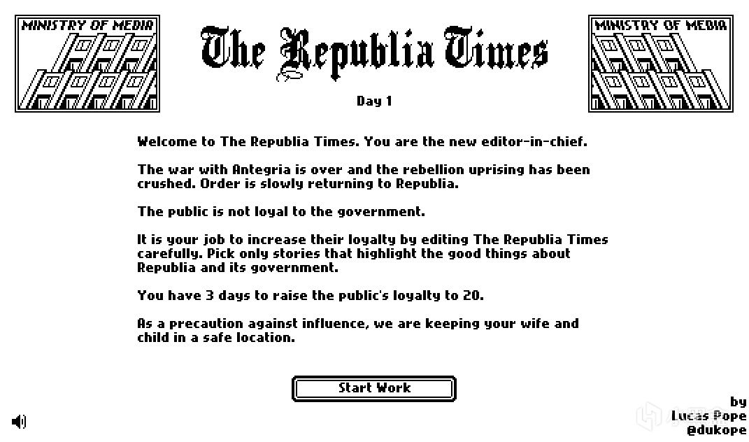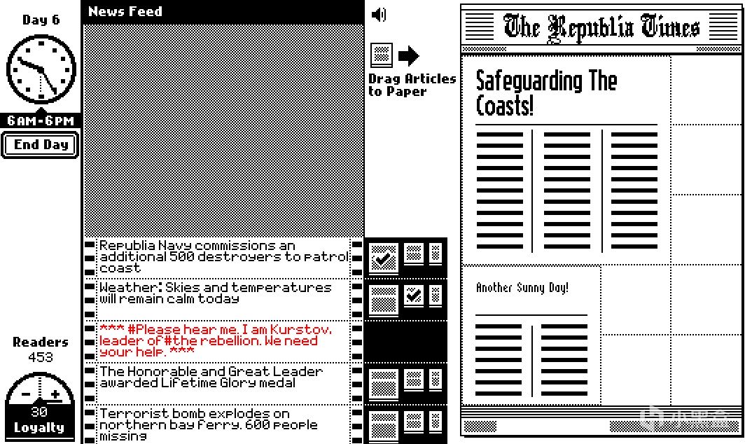 玩家扮演一位战后新建报社的编辑,支持战后共和国的复兴。每天,玩家都需要编辑报纸的版面,让报纸只展示正能量的内容,提高民众的忠诚度。