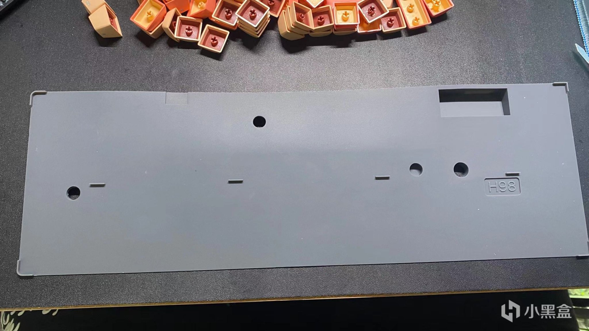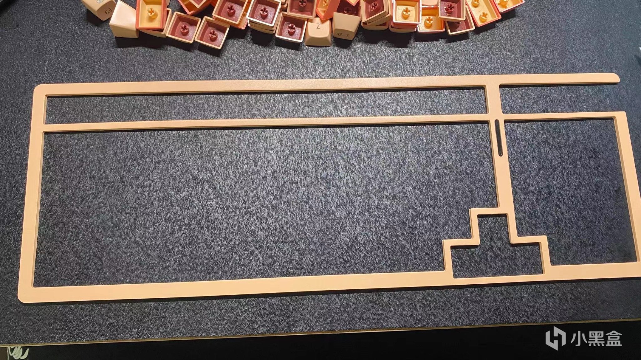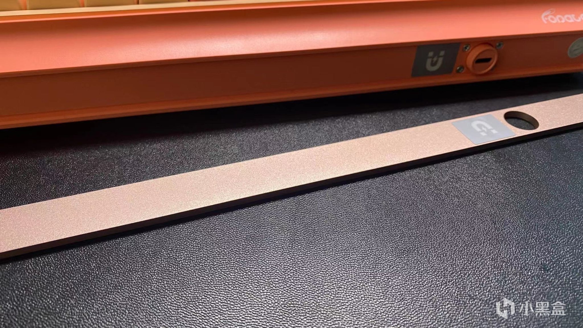 将键盘拆解之后就可以看见这个上盖其实上面还有一个金属的装饰条的,这个装饰条也起到了一个增加重量的作用,这里是很好的,也是这把键盘这么瓷实的一个重要的原因。