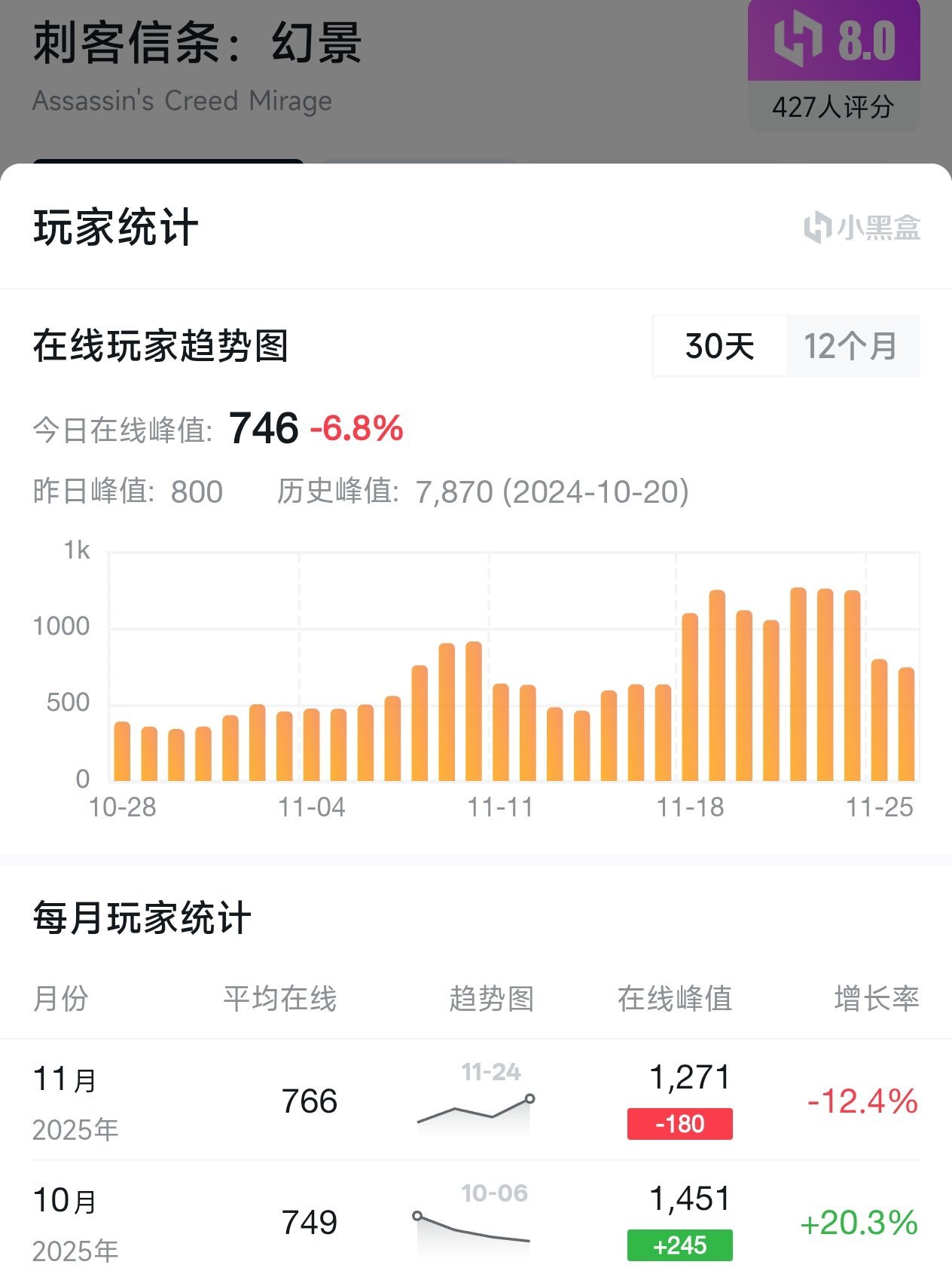 该DLC在Metacritic的PS5版玩家评分高达9.4分,以其引人入胜的剧情和7-10小时的丰富内容获得好评。然而,高质量内容并未能有效提振游戏在Steam平台的人气。DLC发布后,《幻景》的每日在线人数峰值仅从之前的500人左右升至四位数,仍远不及其历史峰值的7867人。与此相比,《刺客信条:影》的历史在线峰值达到64825人,《英灵殿》为15679人,使得《幻景》成为该系列在Steam平台表现最不理想的作品。“回忆山谷”DLC在Steam上的下载量仅约一千余人,反映出玩家对本作的兴趣有限。
