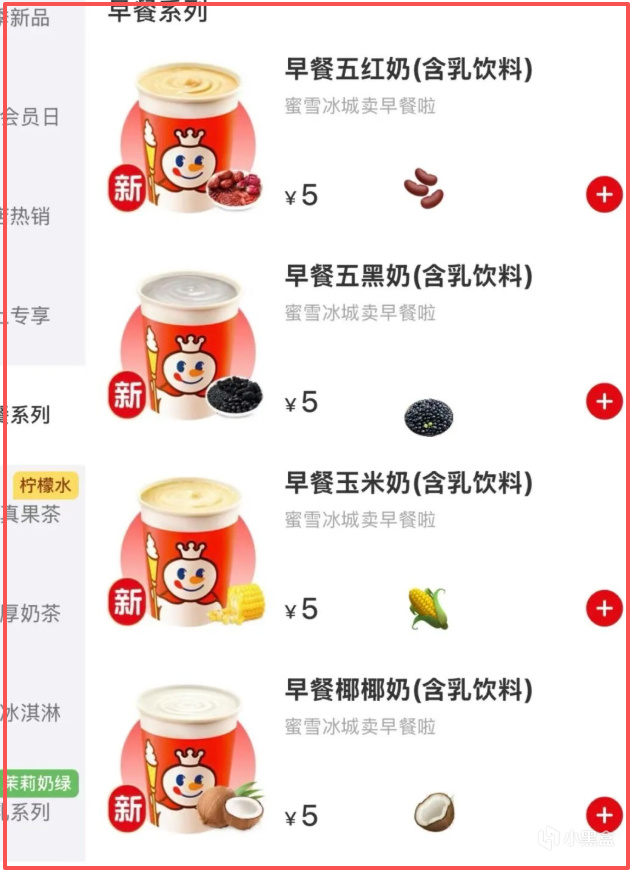 除了品类,问卷还详细询问了价格接受度、食用场景等问题,细致程度让网友猜测其上线早餐已是箭在弦上。更有意思的是,有网友晒出菜单截图,蜜雪冰城早已推出 5 元一杯的早餐奶系列,红豆、椰奶等口味齐全,只是此前被当作热饮售卖。