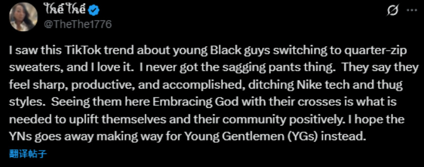尽管,在这股风潮中有很多创作者单纯是在整活、解构,甚至嘲讽他们的“有钱”黑人同胞是在装作白人。但更多的声音,都给予了相当正面和积极的回应——尤其女性群体,她们认为这标志着一种思维转变,至少能让那些黑人男性看上去更加绅士、更加负责。