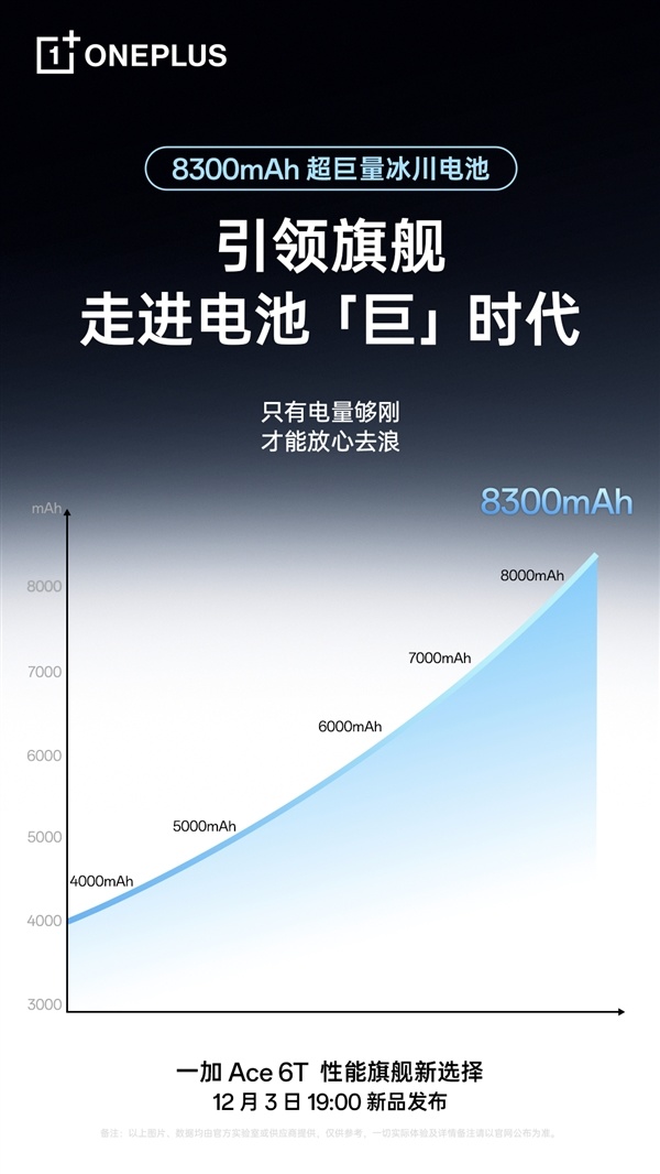 快科技11月28日消息,一加中国区总裁李杰介绍,一加Ace 6T将全球首发8300mAh超巨量冰川电池,是目前全球电池容量最大的性能旗舰,正式引领旗舰手机电量进入8000+mAh时代。