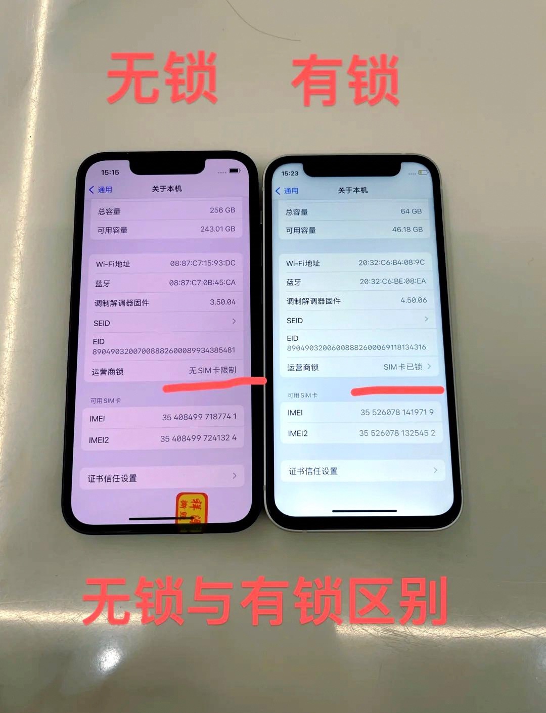 无锁/有锁机:这里的锁是运营商锁,在通用-关于本机里可以查看。无锁机可以直接插卡使用,有锁机需要配合卡贴使用,所以也叫卡贴机。有锁机会比无锁机便宜,电池健康更高,但操作麻烦,动手能力强的可以购买,购买之前要问清楚是哪个运营商锁,购买相应的卡贴