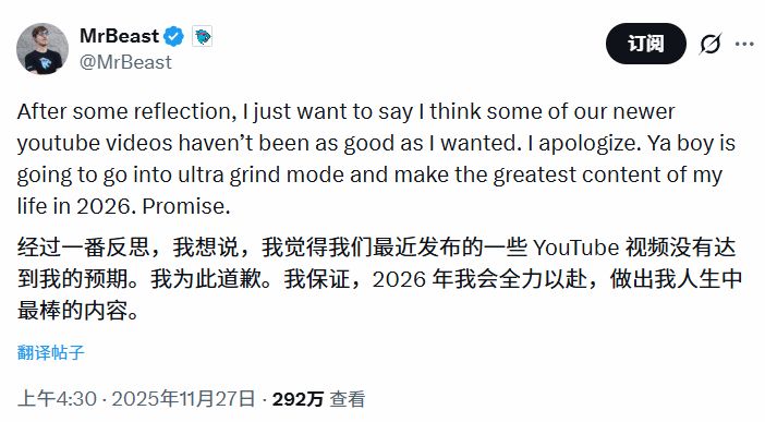YouTube巨星“野兽先生”吉米·唐纳森(MrBeast)近日罕见公开道歉,承认近期视频质量未达预期,并承诺将在2026年带来职业生涯最佳内容。