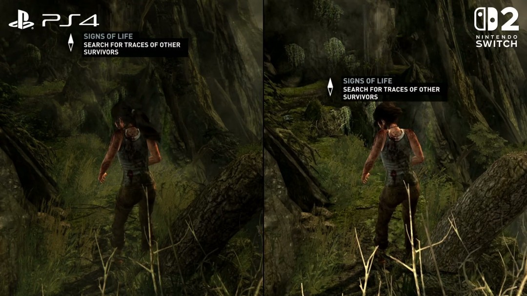 与PS4版相比,Switch2版本在阴影分辨率、动态阴影效果和环境光遮蔽上大幅削减。植被系统被简化,动态阴影变为静态,远景树木明显减少,导致游戏环境氛围感大打折扣。更让玩家费解的是,Switch2版本仍缺失劳拉的TressFX动态发丝技术。这一在PC和次世代主机版中标志性的特效,即使在NS2硬件能力足够的情况下也未被加入。