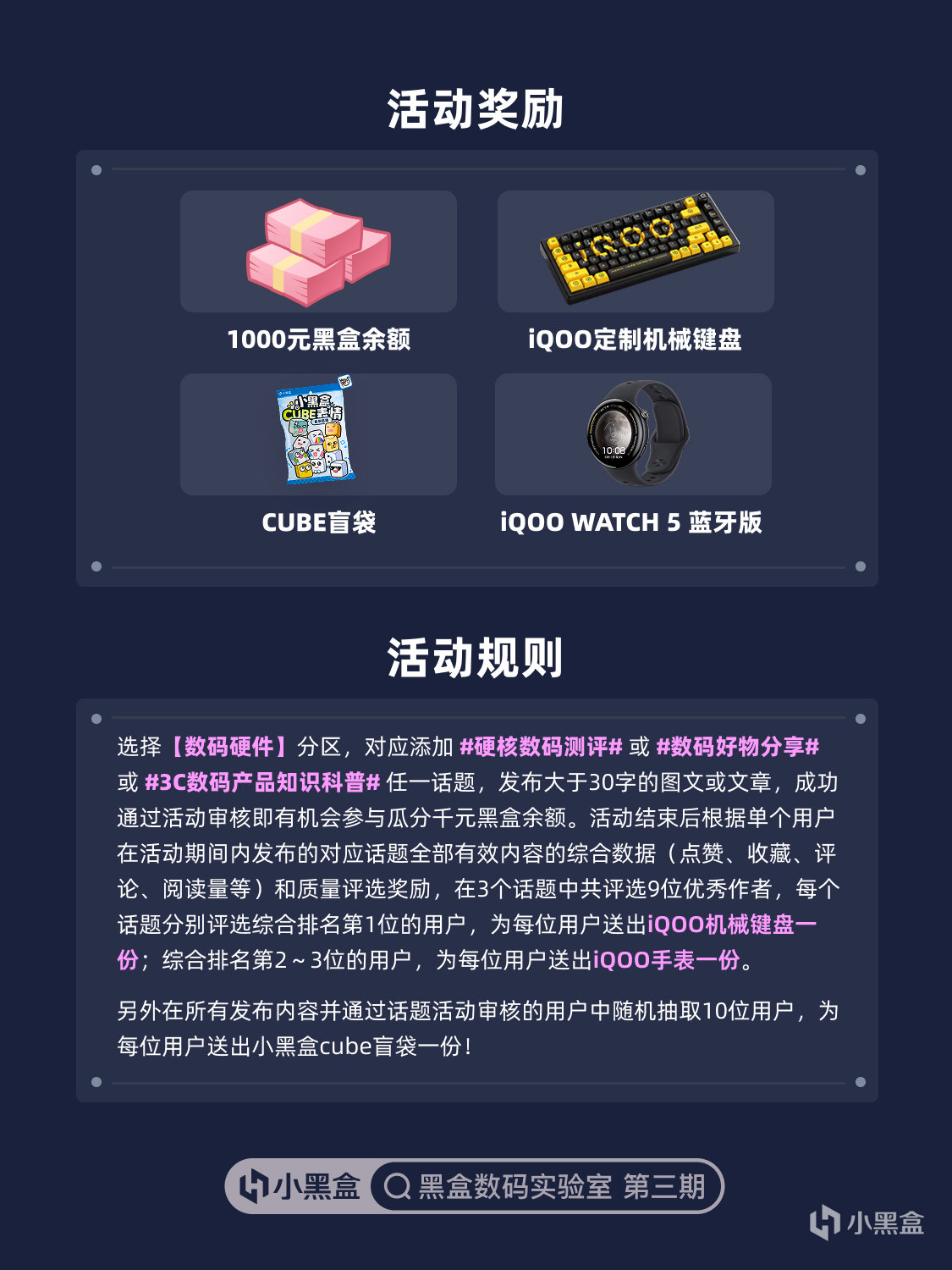 3.幸运参与奖励:活动结束后,在所有发布内容并通过话题活动审核的用户中随机抽取10人送出小黑盒CUBE盲袋一份!