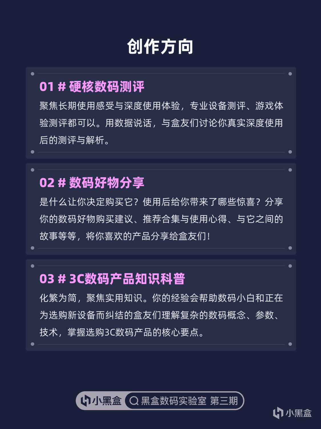 1.#硬核数码测评#:聚焦长期使用感受与深度使用体验,专业设备测评、游戏体验测评都可以。用数据说话,与盒友们讨论你真实深度使用后的测评与解析。