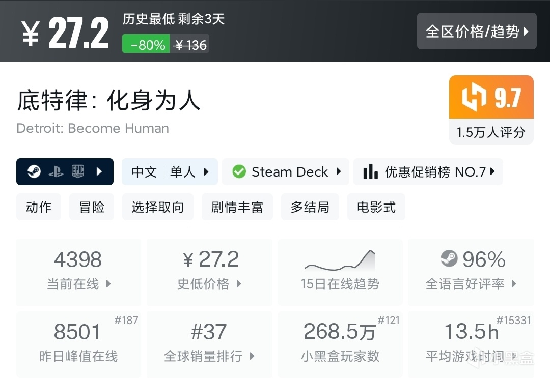 永久涨价后的史低价,2折,不怕背刺。强烈推荐,第一遍玩不要看攻略,跟从自己的内心。30块钱不到,看一场身临其境的几十小时电影,绝对超值!