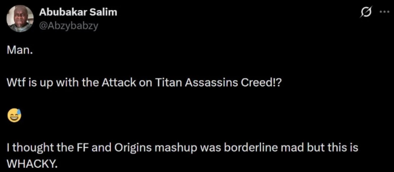 曾在《刺客信條:起源》中飾演主角巴耶克的演員阿布巴卡爾·薩利姆近日發文批評《刺客信條:影》與《進擊的巨人》的聯動內容。他在社交媒體上直言這種跨界“簡直是胡鬧”,並對巨人出現在日本戰國背景中表示不解。