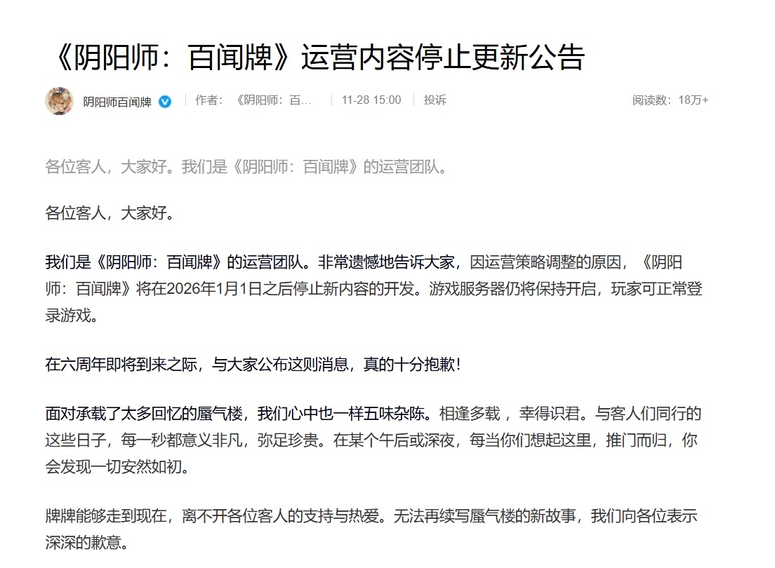 今天(11月28日),网易旗下集换式卡牌游戏《阴阳师:百闻牌》运营团队发布公告,宣布因运营策略调整,游戏将在2026年1月1日之后停止新内容的开发。