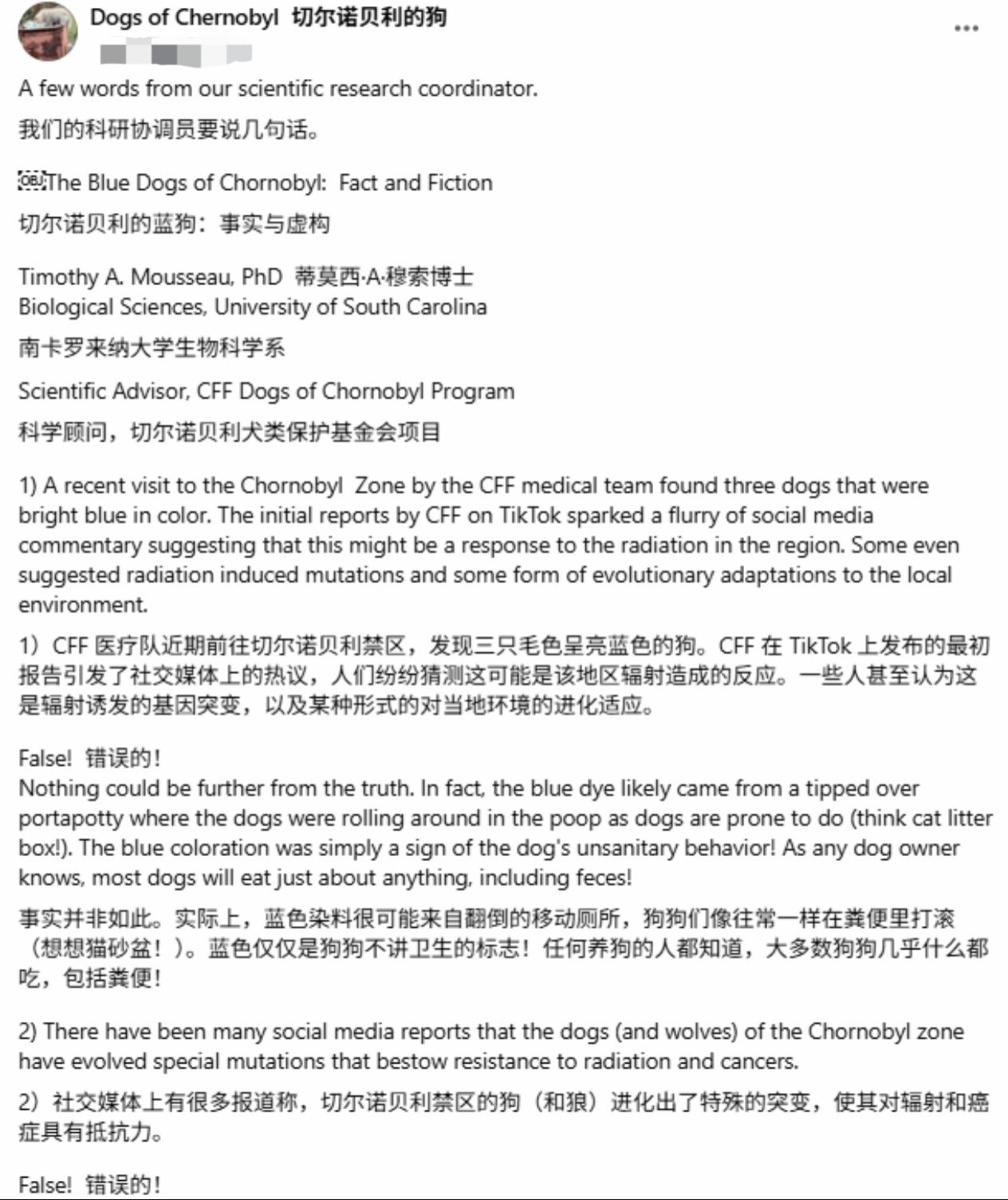 长期研究该地区犬群的科学家Timothy A. Mousseau解释,这些流浪犬是在翻找垃圾时,在倾倒的移动厕所污物中打滚,毛发吸附了蓝色成分污染物。兽医检查确认它们没有任何辐射相关疾病或基因损伤迹象。目前约有900只流浪犬生活在切尔诺贝利隔离区,它们大多是1986年核事故后被遗弃宠物的后代。专家指出,切尔诺贝利禁区并非整体高辐射区域,约30%的土地辐射显著,其余70%相对安全。