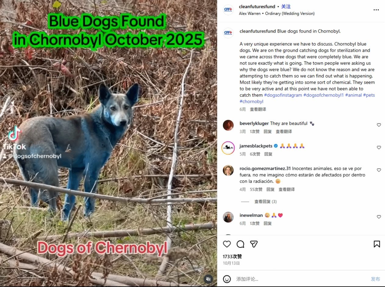 切尔诺贝利隔离区出现的“蓝色流浪犬”引发全球关注后,专家团队公布调查结果:这些犬只的蓝色毛发并非辐射变异所致,而是接触环境中的染色物质造成的。