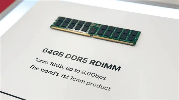 第一个是看似普通的64GB DDR5 RDIMM,不过全球首个采用了先进的1cnm工艺,是1anm、1bnm的进化版,单颗容量16Gb(2GB),单条容量64GB,最高速率8000Mbps。