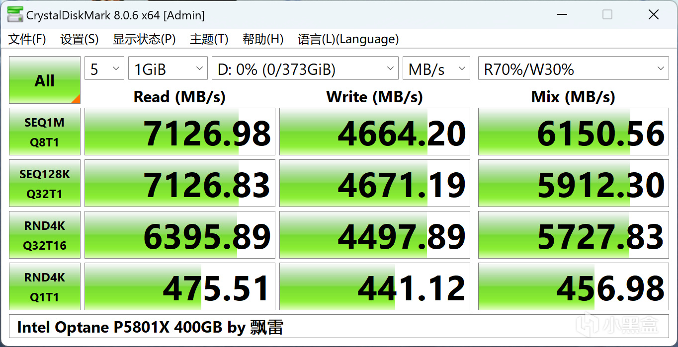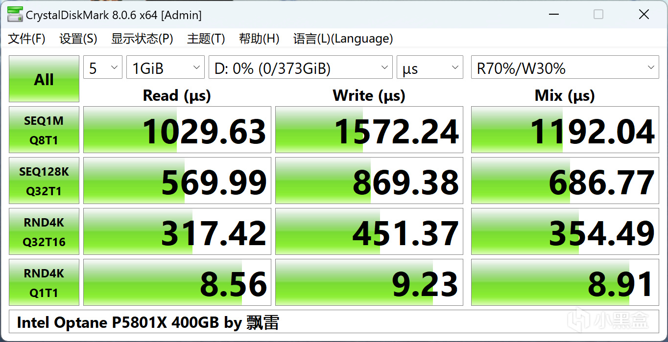 而在多队列随机读写测试中,傲腾P5801X的测试结果初看起来也没啥特殊的,但要知道傲腾表里如一的意思就在于,它没有SLC Cache,你看到的这个速度,就是它全盘写满后的真实速度。而消费级SSD在这种测试时展现的是基于SLC Cache加速后的虚假成绩,只有傲腾,测出来啥样,实际就是啥样。