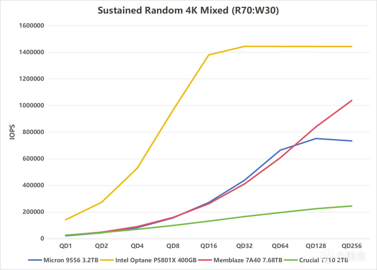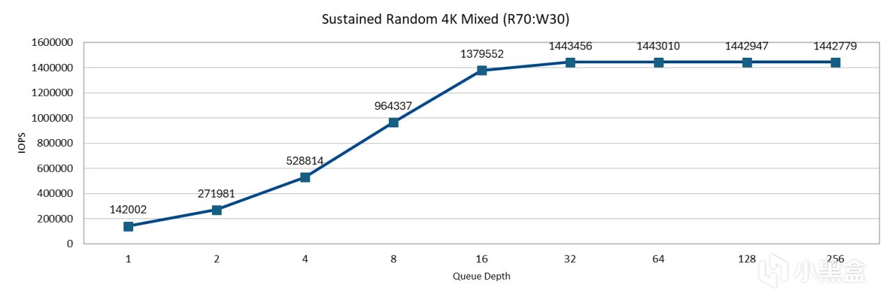 在QD1-QD256不同队列深度下,傲腾P5801X的7读3写混合随机性能逐渐上升,最后稳定在了1443 KIOPS左右: