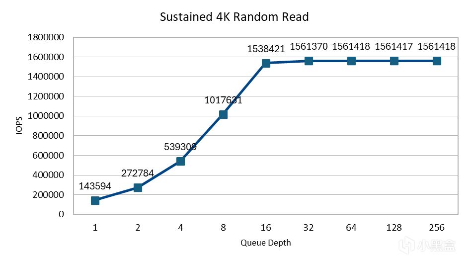 在QD1-QD256不同队列深度下,傲腾P5801X的4K随机读取性能倒是不算高,最后只稳定在1561 KIOPS左右: