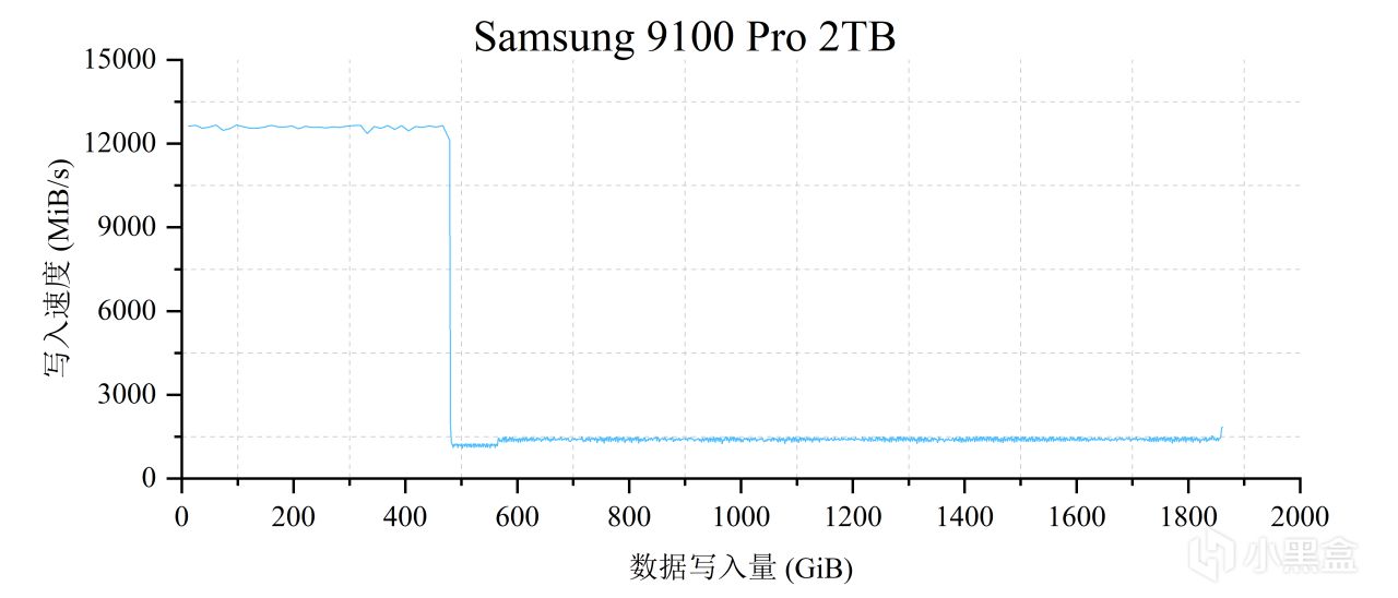 在128K Q32T1全盘写入测试过程中,普通消费级SSD在写满SLC Cache后,会经历一个速度骤降的过程,比如三星9100 Pro: