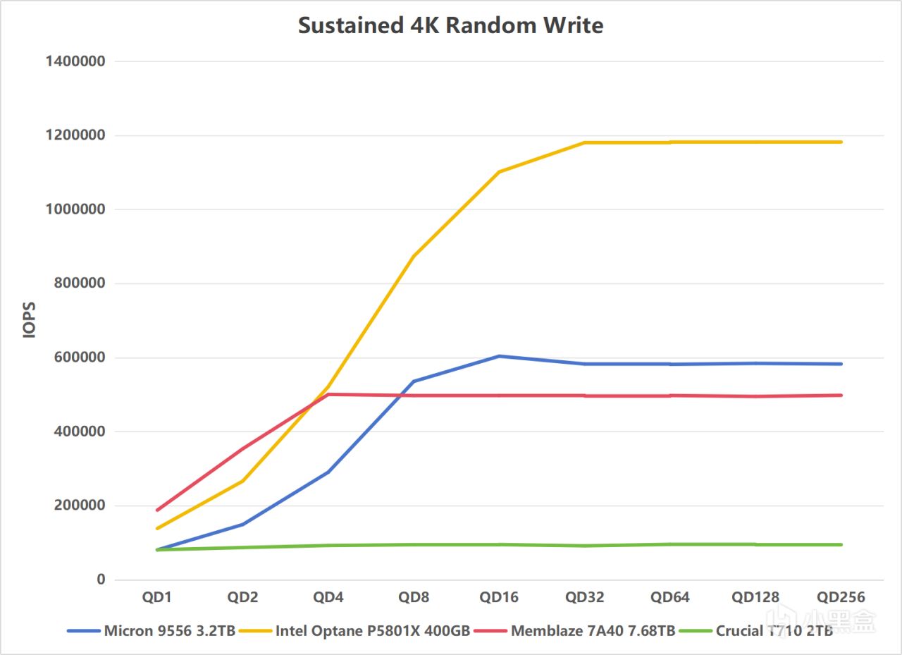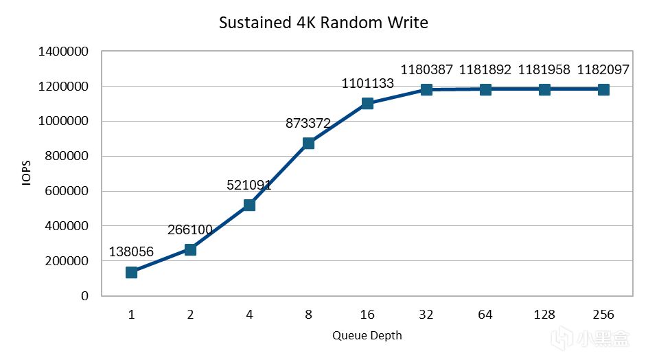在QD1-QD256不同队列深度下,傲腾P5801X的4K随机写入性能稳定在1182 KIOPS左右,超过了Intel官方给出的参考数值: