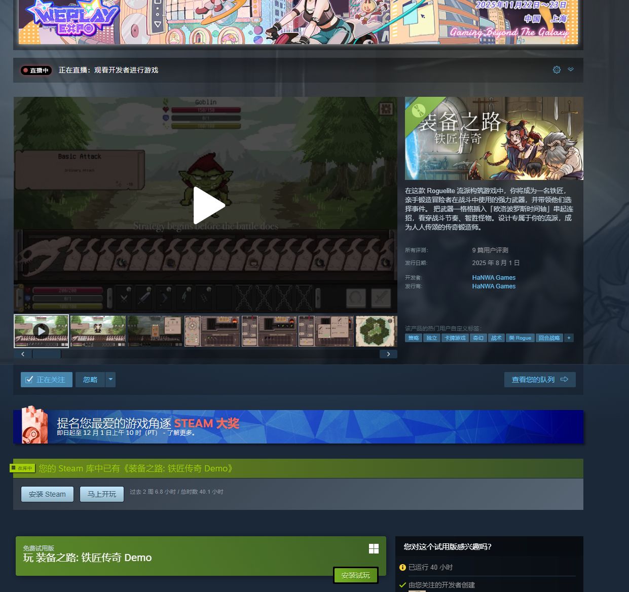 提前规划好接下来 20 秒要发生什么,一步步下指令;用「武器 + 时间轴」来编排战斗流程,把晕眩、格挡、爆发插在刚刚好的时间点;在Roguelite流派、天赋盘、词缀和随机事件里慢慢摸索,试着找到属于你自己的那一套 BD / 流派;那真的非常欢迎来帮我们这个小小的独立游戏一把,试玩几局《装备之路:铁匠传奇》的 Demo。
