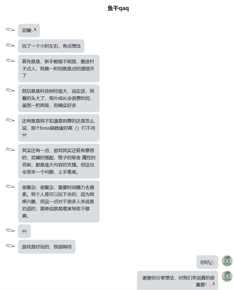 大概又过了一小时,我们收到了他「实际游玩一小时」之后写的超认真长文反馈:
