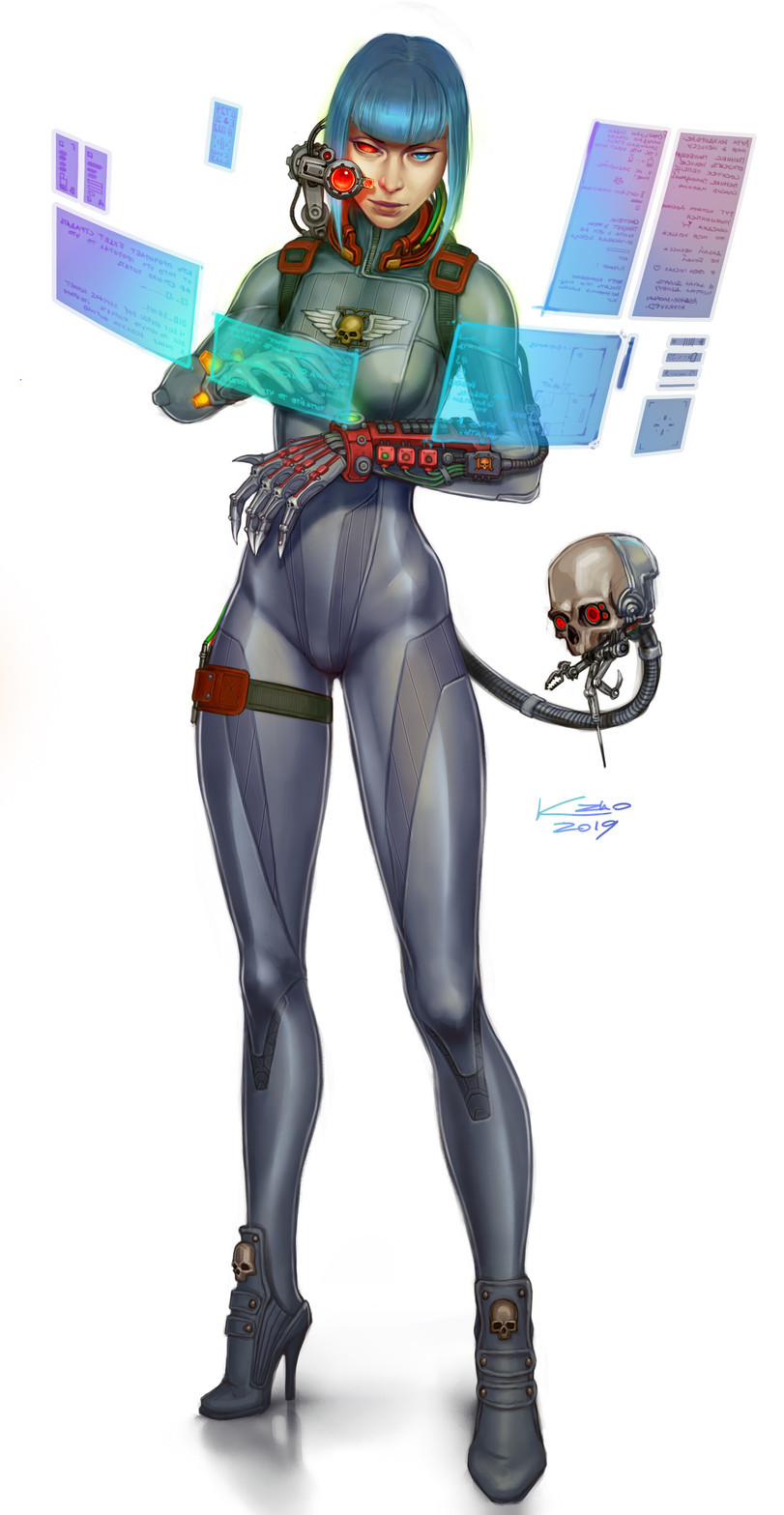 I形颅骨徽章(镶嵌帝皇圣物碎片),内置数据探针(可入侵任何帝国沉思者)、声波解锁器,高阶版本还带有微型电击装置和灵能威慑场。