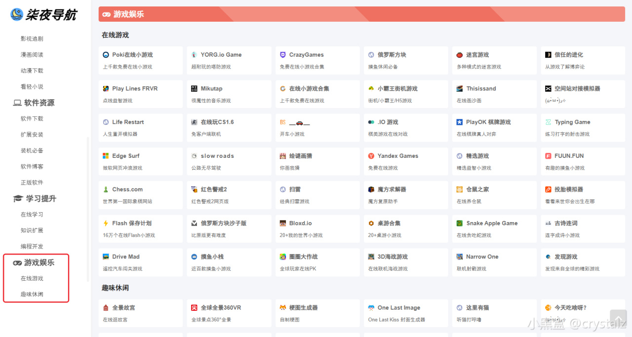 其中「游戏娱乐」分类收集了 80+ 休闲娱乐网站,摸鱼爱好者记得悄悄收藏!