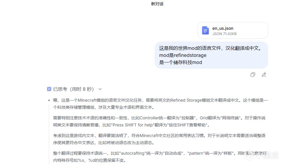 再將複製到桌面的en_us.json文件副本扔給AI翻譯,這裏我就用deepseek示範。