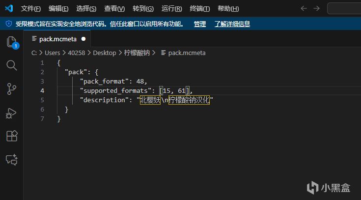 4.回到一級文件夾[檸檬酸鈉]中,可以用記事本創建一個文本,名字改成pack,後綴擴展名改成mcmeta,需要在pack.mcmeta文件中寫一些簡單的程序即可。