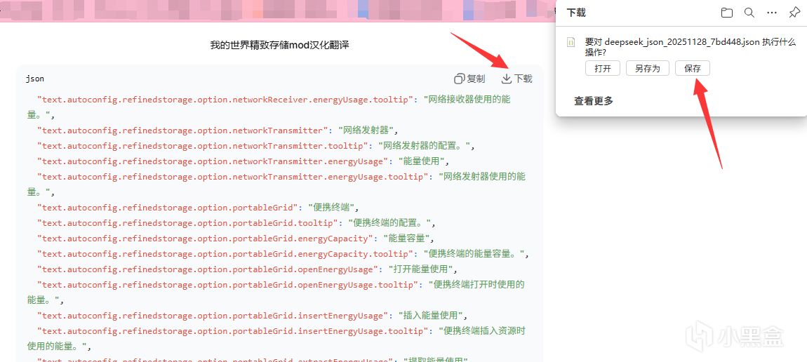 5.當生成結束後,可以選擇下載或複製,保存出來,名字命名爲zh_cn,後綴需是json,在deepseek下載是直接以json格式保存好的,也可以創建TXT記事本,將文本複製進去,再修改名字。