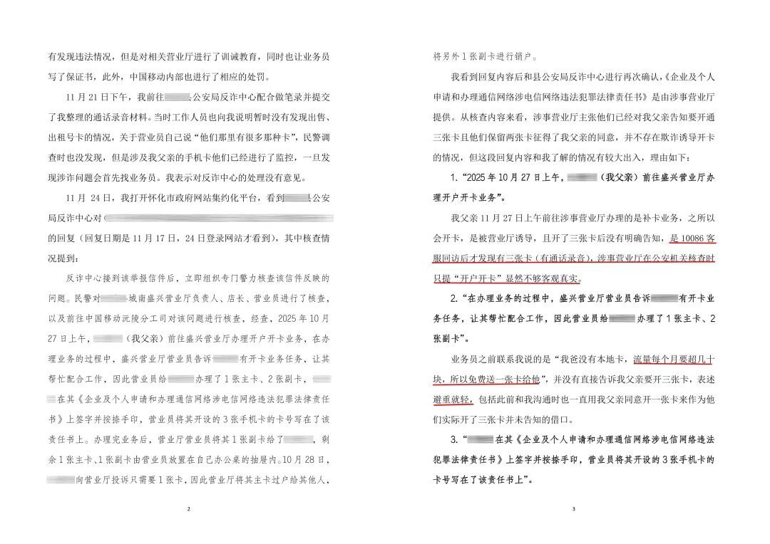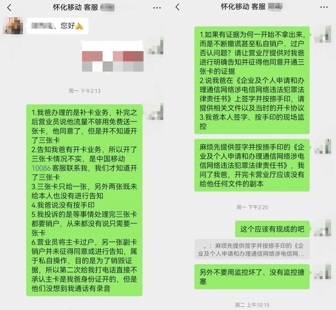 客观地说,我从开始到现在真的没想把事搞大,一开始只是想查一下套餐情况,然后让我爸自己去注销掉,甚至发现我爸被开了三张卡之后我也明确表示不想花太多精力在这个事情上,只要他们给出真实的书面情况说明,我可以保证之后不再追究。