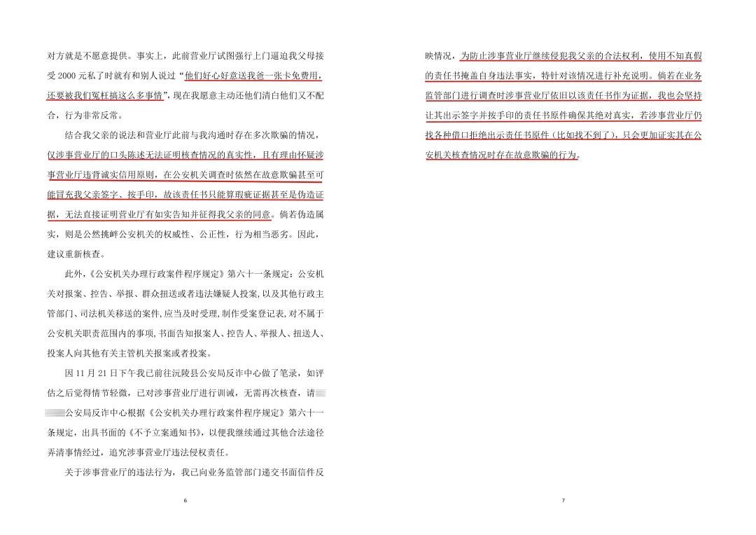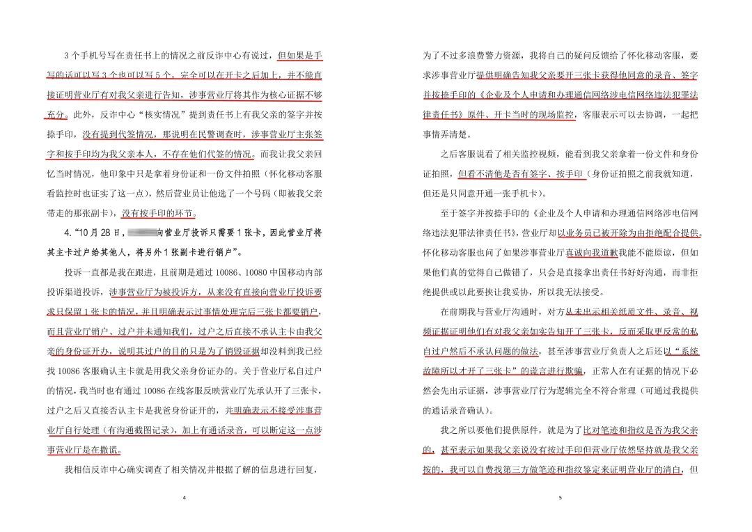 但是后面看到他们的核查情况,概括来说就是营业厅认为虽然他们保留了用我爸身份证开的两张手机卡,但有如实告知且征得我爸的同意,所谓责任书的签字和手印都是我爸按的,过户销户也是我们授意的,他们唯一违规的地方就是保留了两张卡。