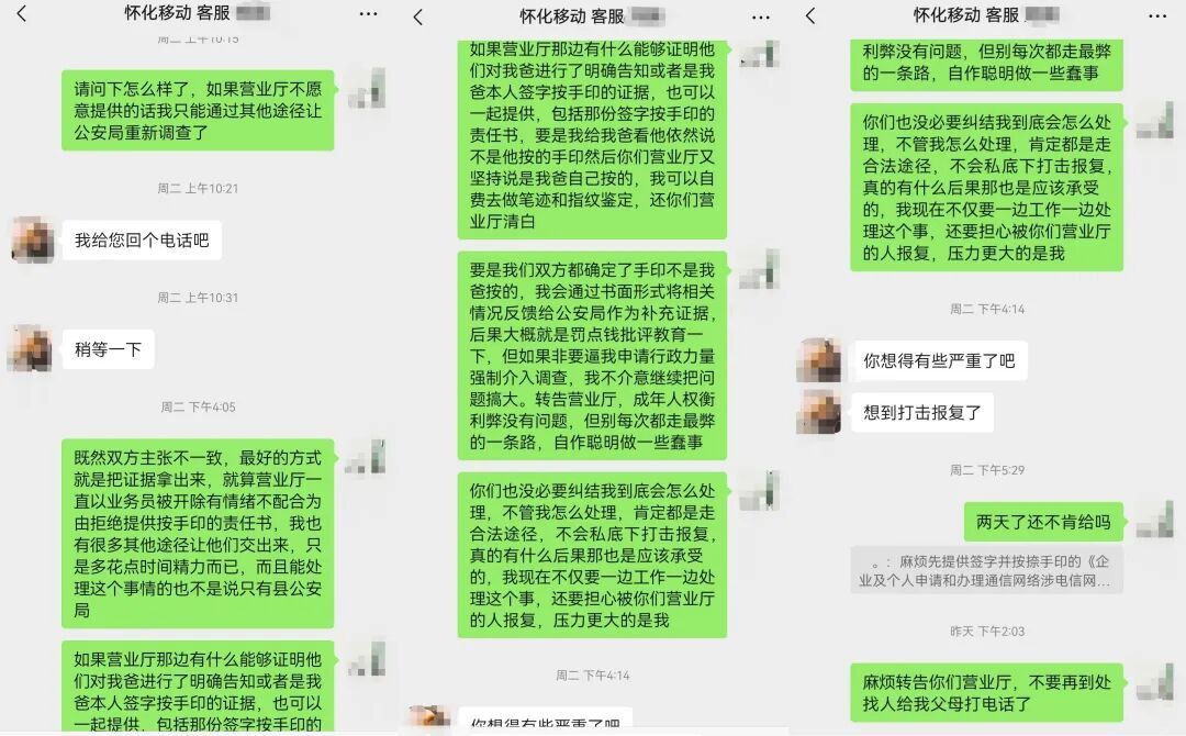 因为移动营业厅一直在撒谎导致我们无法接受他们的道歉、赔偿,所以他们之前就找了好多人给我爸妈打电话,试图避开我从我爸妈入手强迫我们接受和解,这已经构成软性威胁了,但举证很难,追责更不容易。另外还有什么某某乡的乡长、某某村的书记这种从来都不认识的人来直接或间接让我爸妈别再追究,个别认识的人则在背后议论说我小题大做,不懂得见好就收。