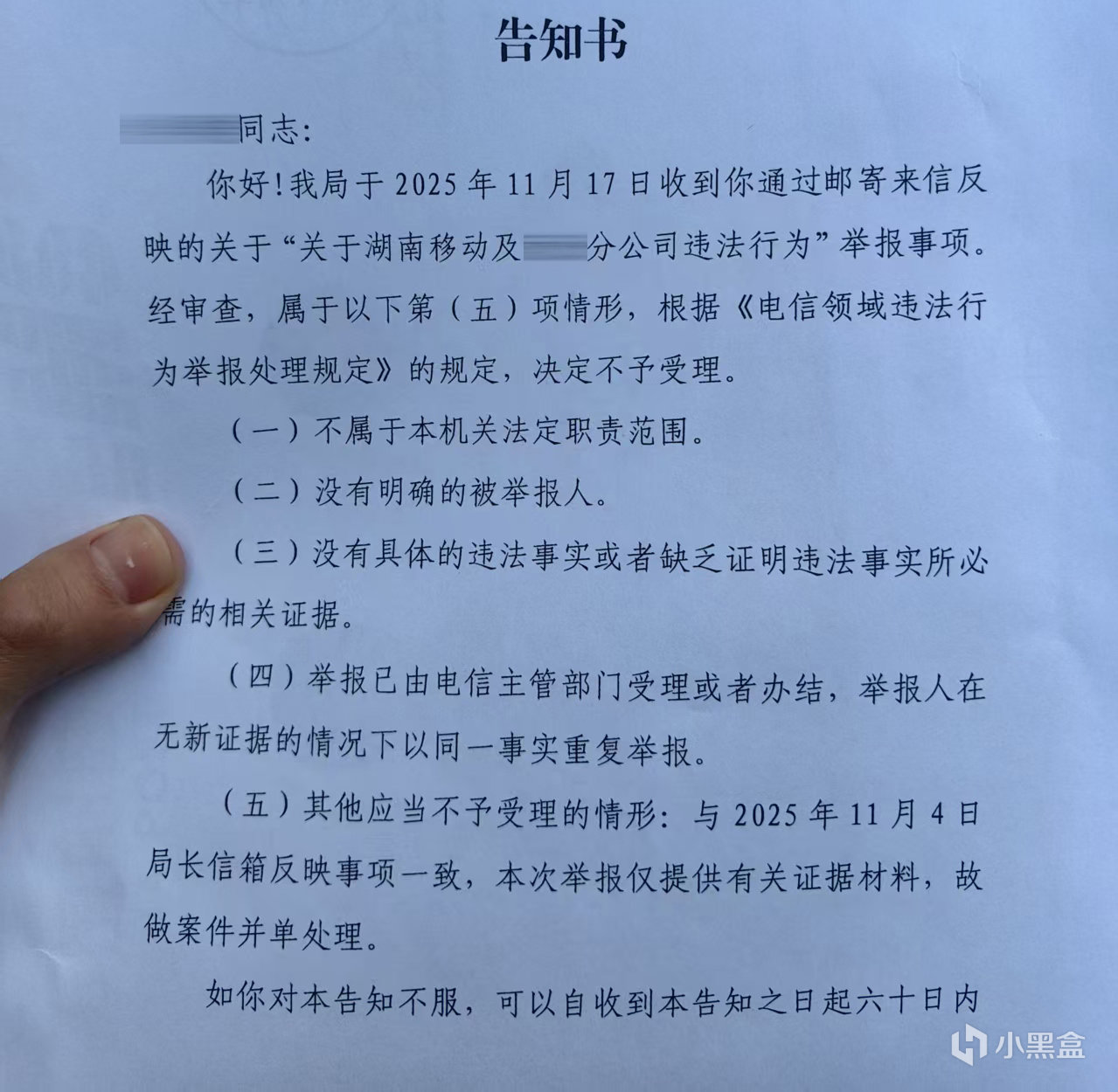 在我的强烈要求下,过了半个月,市移动公司终于出面说会进行处罚,听说业务员被开除了,营业厅和县移动分公司也都被处罚了。他们怎么罚的我一点兴趣也没有,所以让我去看的时候也没有去,同时我也表示内部已经处罚之后不会再通过内部渠道投诉纠结处罚是否过轻,但内部处罚不能代替行政处罚,向相关部门反映问题进行追责依旧是我的合法权利。最近收到了省通信管理局的回执,和之前的线上举报进行并案处理,还在调查中。