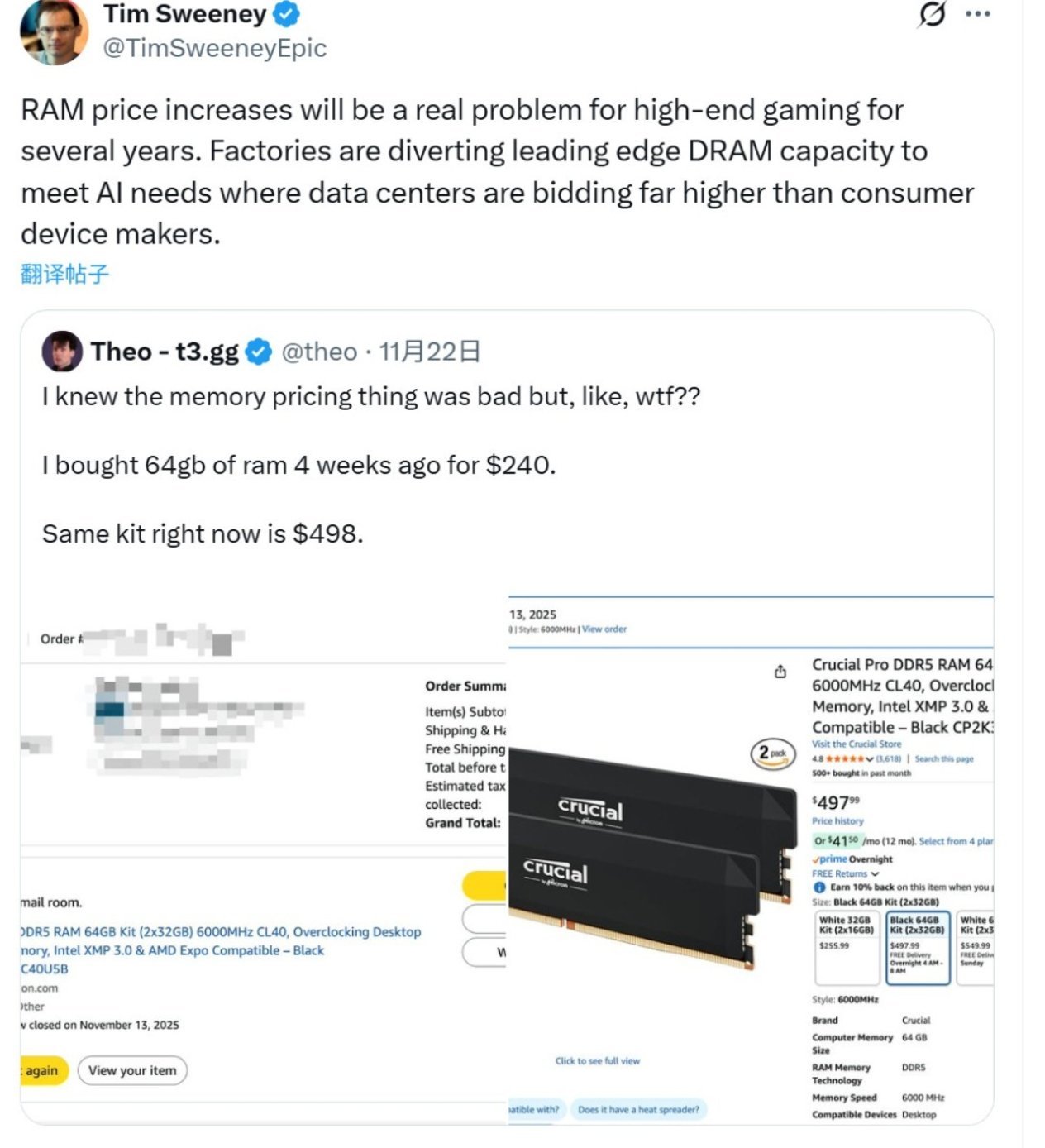 Epic Games首席执行官蒂姆·斯威尼近日在社交平台发出警告,指出内存价格的持续上涨将对高端游戏产业产生长达数年的负面影响。