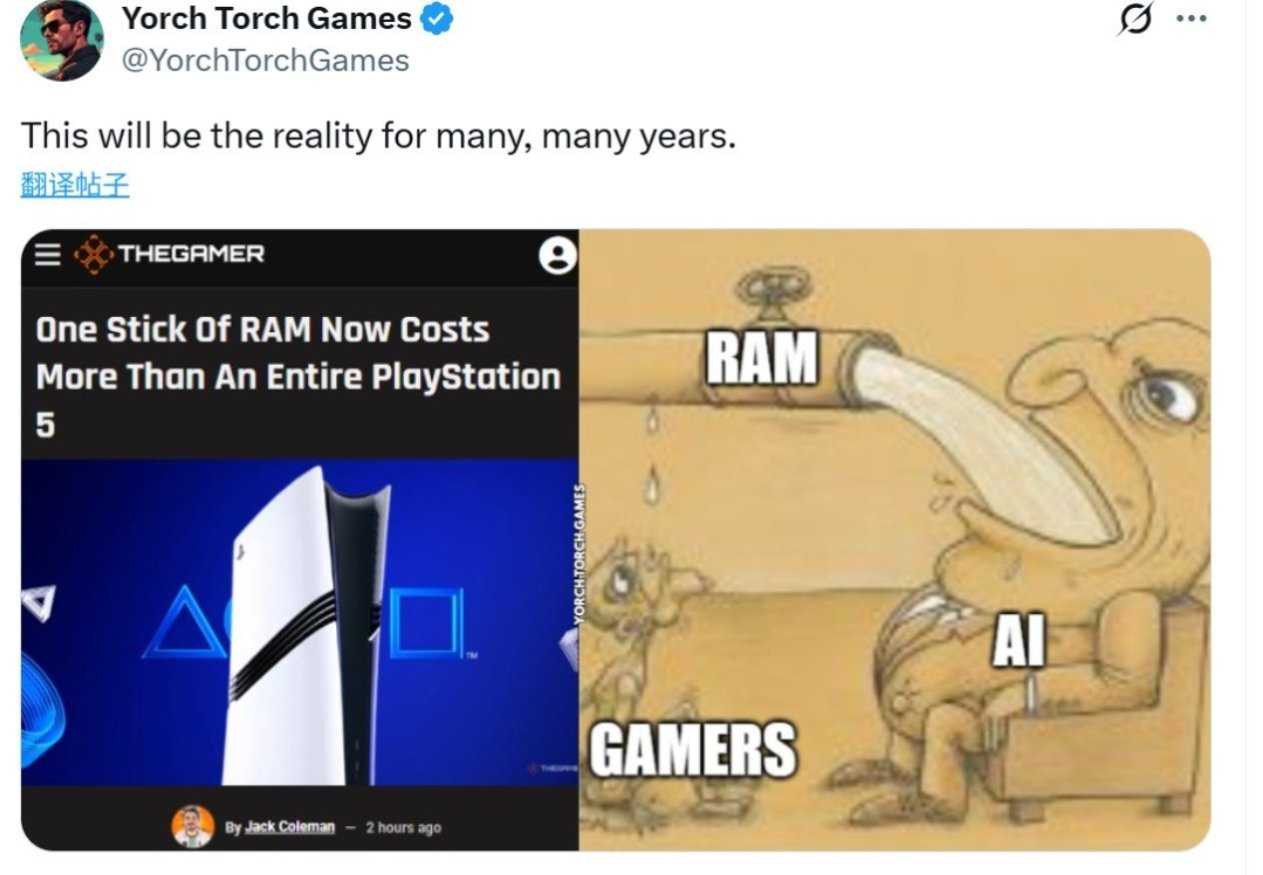 这一警告是针对消费者反映内存价格飙升的回应。有用户表示,10月中旬以260美元购买的64GB内存在“黑五”期间飙升至498美元,涨幅惊人。目前高端64GB内存套装价格甚至超过了一台PS5主机的售价。斯威尼分析认为,价格暴涨的根源在于DRAM制造商正将最先进产能转向利润更高的AI领域,数据中心愿意支付远高于消费设备厂商的价格。这种结构性转变意味着游戏行业将长期面临内存供应紧张和成本压力。