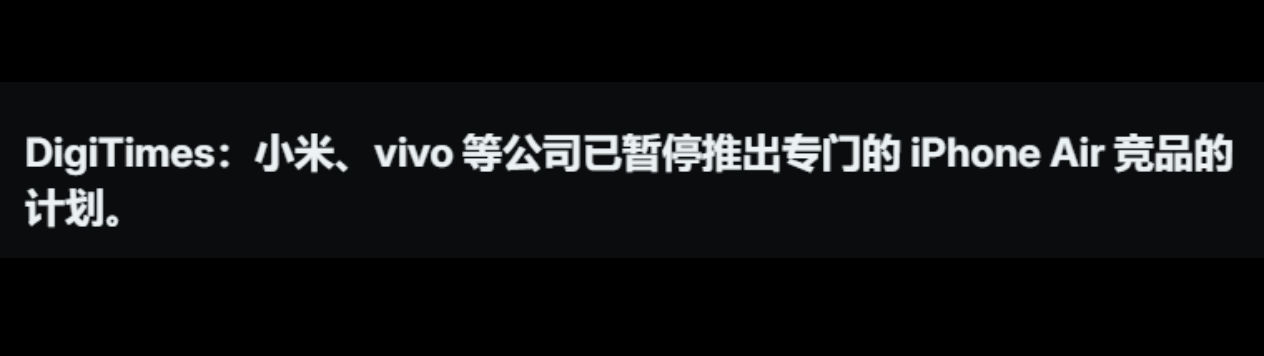 iPhone Air上市后销量未达预期,苹果已大幅削减生产订单,其代工厂富士康计划在11月底前停止所有iPhone Air生产线,另一家代工厂立讯精密已于10月底结束生产。受此影响,小米、OPPO、vivo等国内主要手机厂商已暂停或重新评估原定于2026年推出的超薄手机项目。