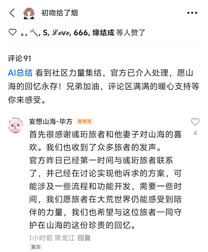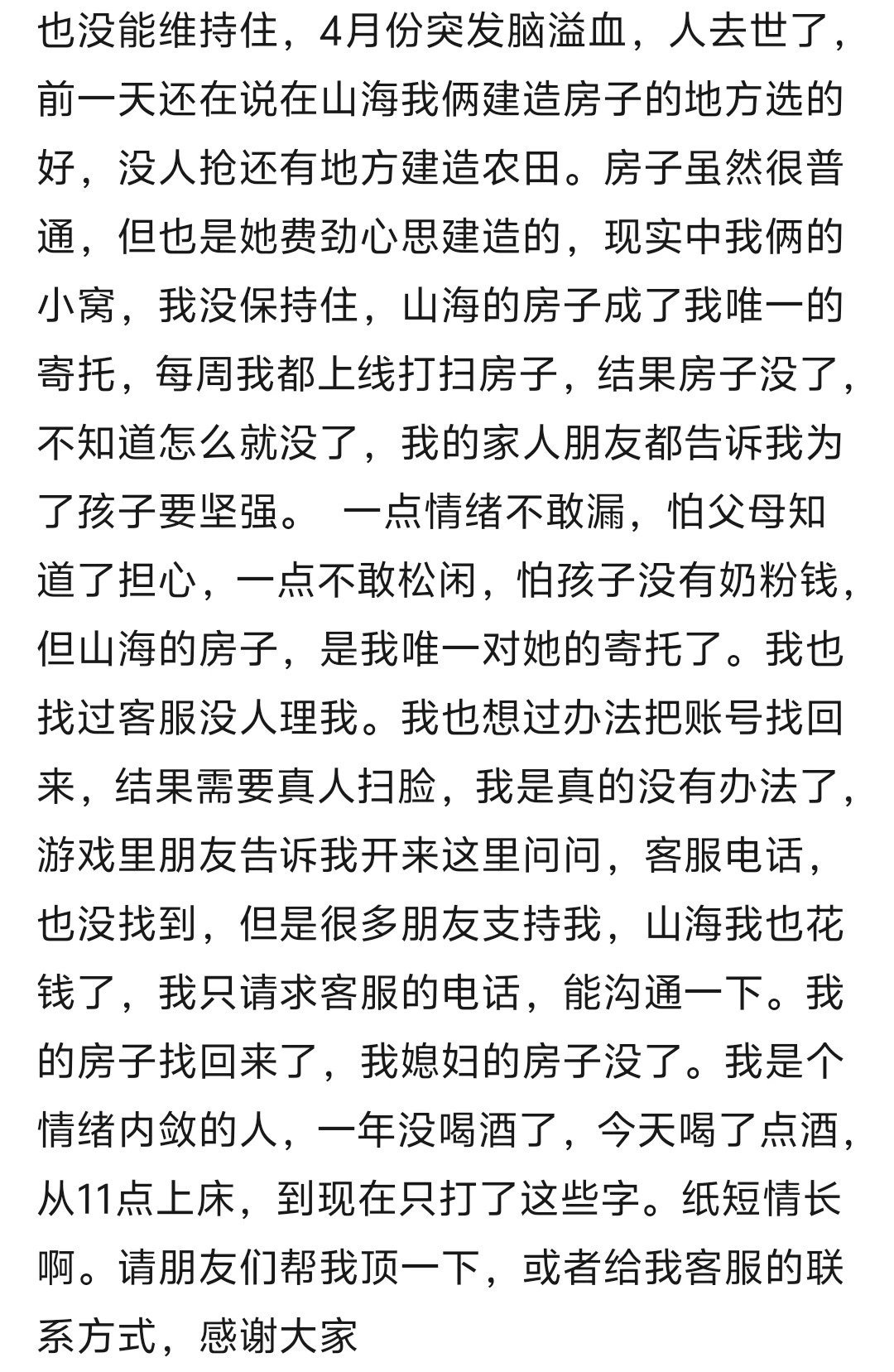 《妄想山海》手游官方回应称,官方已经第一时间与该名玩家联系,并已经在讨论实现他诉求的方案,可能涉及一些流程和功能开发,需要一些时间。最终,在客服帮助下,其妻子账号已找回,房子也已经成功修复。